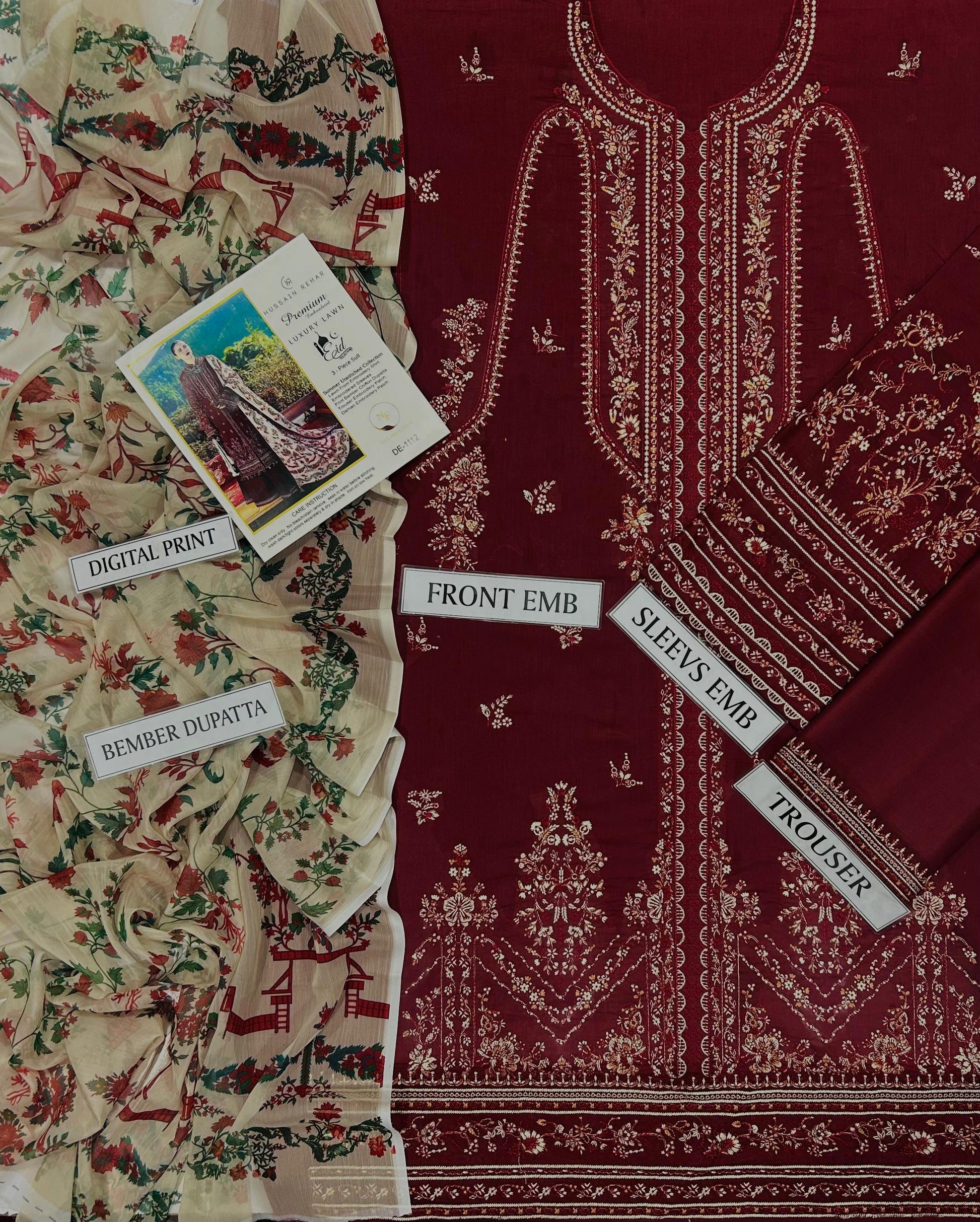 3 pc luxury lawn embroidery suit by Hussain Rehar code #005